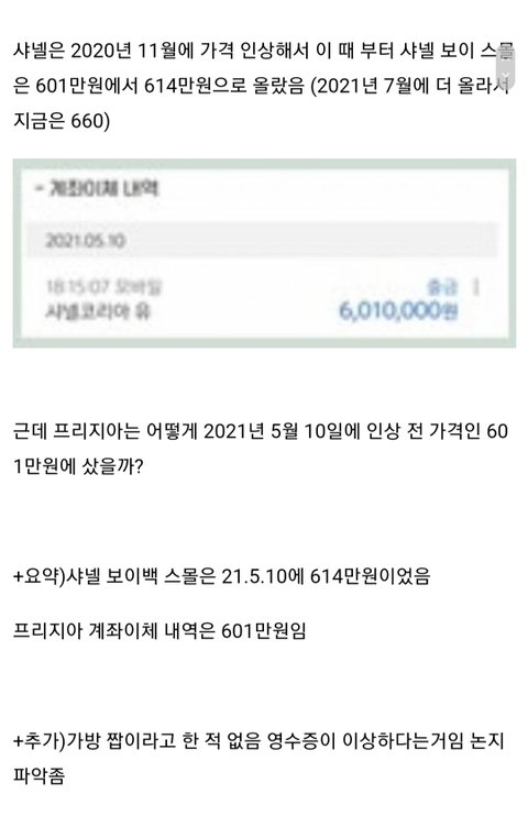 시녀도 안티도아님- 영수증 의심되는건 분명함. 이체내역이랑 제시한 영수증이 현재 매장서 프린트되는 영수증이랑 다르고 절대 영수증ㅇㅔ는 품목을 한번에 적지 않음ㅇㅇ. 상식적으로 집앞 씨유만가도 열개사면 열개품목을 다 적어주지않나? 열개샀는데 아이스크림 외 9개라고 안적어준다는거죠. 구매이력 또한 샤넬의 데이터베이스로 쓸꺼고 샤넬은 똑같은 의류나 시즌제품을 못사게하기에 (다른색상은 허용) 가죽제품의경우 기간마다 구매할수 있는 개수가 내부 규칙으로정해져있고 교환,환불 등 이후 문제가 생길시 업무처리하기에 중요한 정보기 때문에 샤넬에서 품목을 하나만쓰고 두개 제품을 결제했다고 보기엔 이상하죠. 루이비통도 같음, 대부분 M으로 시작하는 품번명을 적어 영수증을 발급함ㅇㅇ 절대 여러제품을 한가격으로 적는 경우가 없다는거임. 샤넬가방의 경우 정품인증? 간단해요 이제는 가방의경우 개런티카느가아니고 내장 칩이기 때문에 내 가방들까지 짭취급받는다? 당장 들고 매장가서 가방내 칩으로 조회하면 됩니다. 내장칩조회해서 구매영수증 또는 카드내역서만 캡쳐하면 되는거죠. 명품감정원에서 해준거면 더 편해요. 가방 맡기고 명품감정원에서 정품일 경우 자체로 정품을 보증해주는 종이와 카드가 있습니다. 그것만 올리면되는거죠 구구절절설명없이. 무튼.. 그려려니 내 현생살기에 바빴는데 오히려 해명영수증 및 이체내역보고 개인적으로 더 의아하네요. 아니면 부산 샤넬직원이 일을 드럽게 못하고 메뉴얼대로안해서 (영수증처리, 배송문제(샤넬은 택배안함), 가격오류) 프리지아한테 운이 안좋게 피해가 간거고, 해당 경우면 구매이력조회시 서브한 직원이 뜨기때문에 업무처리를 제대로안해서 피해가난거라 클래임걸수있구요.