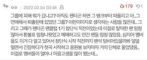 뭐하냐 너네??? 생각해주는 척 하면서 멕이는 이 글이 더 별로임. 남 이야기에 이러쿵저러쿵 하지말고 두시간전에 뜬 펜타곤 뮤직뱅크 일위 앵콜 영상이나 봐. https://youtu.be/Bm3BE34Et8w 군백기에 계속 성장해 나가는 그룹 흔치않다.