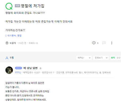 이 부분에 대해 신랑이 자기가 왜 큰집에 가야하는지 모르겠다며 처가큰집을 가는 경우는 처음 본다고 합니다.