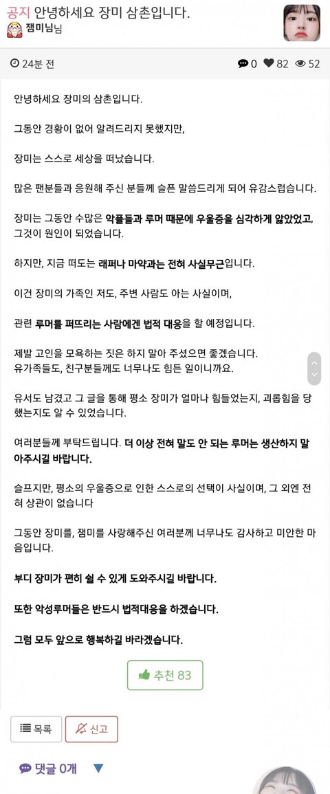 매번 느끼지만 사람들은 왜이렇게 남들을 못잡아먹어서 안달일까... 저분이 연예인은 아니지만 어쨌든 나름 인지도 있던 bj 였던걸로 기억하는데 악플로 결국 돌아가셨구나... 어머님 일도 안타까운데 참 ㅠㅠ 결국 악플러들이 사람 또 죽였구나
