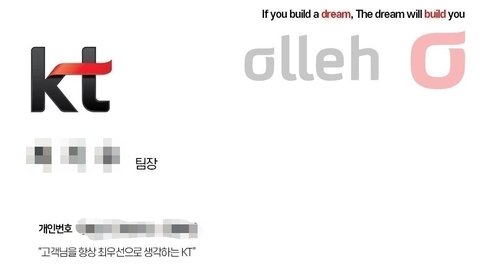 누가봐도 KT 직원 명함, KT에서 발송한 가입보증서처럼 보이도록 위장하였습니다.