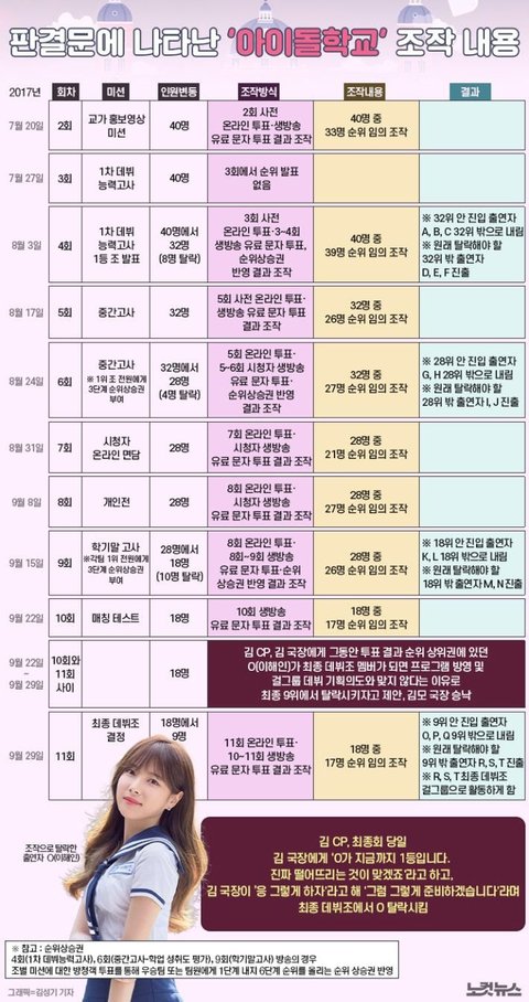 2화부터 33명 조작, 이후 매화, 최종화까지 계속해서 투표결과를 교묘하게 조작해오면서 결국 원하는 구성의 멤버들로 최종 데뷔 멤버를 꾸렸어.