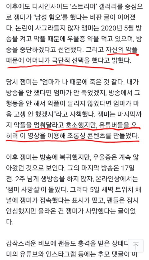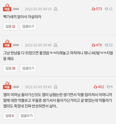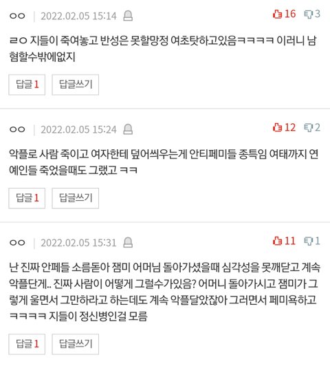 잼미님을 남혐종자로 몰아가면서 악플 달았던건 다들 알거임 잼미어머님 먼저 돌아가시게 하고, 그럼에도 악플을 멈추지 않았음. 결국 잼미님까지 죽음.