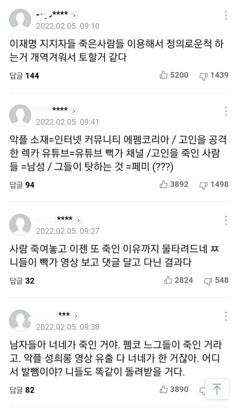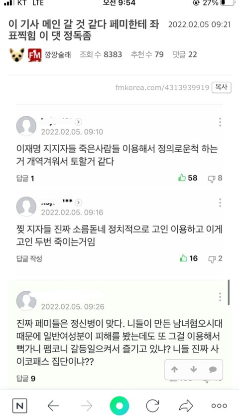첫번째베댓 보셈ㅋㅋ 남초 안티페미들이 죽였다는 댓글 묻히려고 이재명 언급하면서 논지 흐리는 댓글 베댓으로 만듦.