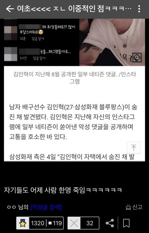 김인혁선수는 남적남으로 죽은건데 뻔뻔하게 여초탓하고있음ㅋㅋㅋㅋ ㄹㅇ역겹죠?