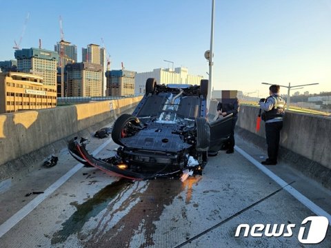5일 오전 7시25분쯤 부산 동구 충장고가로에서 부산역 방향으로 달리던 SUV 차량이 벽을 들이받고 전복됐다.