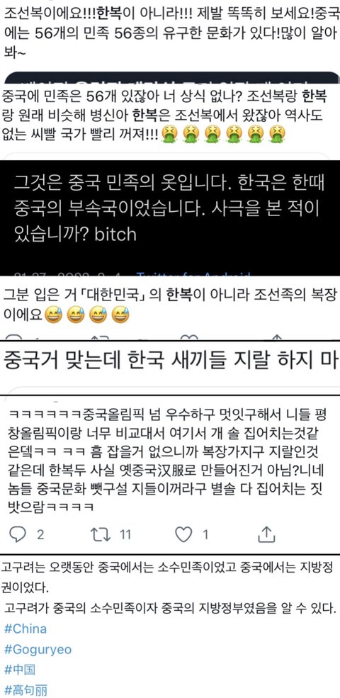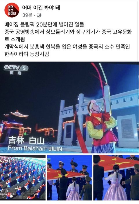이번 중국올림픽 개막식때 우리나라 “빼고” 송출한 장면임 한복입고 김장, 윷놀이, 김밥, 강강술래, 한과 등등 조카 여러가지 송출함 제발 퍼트려줘 아무곳이나 좋으니까 타커뮤 카페 트위터 틱톡 에타 페북 유튜브 다 상관없어 퍼트려줘