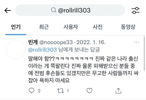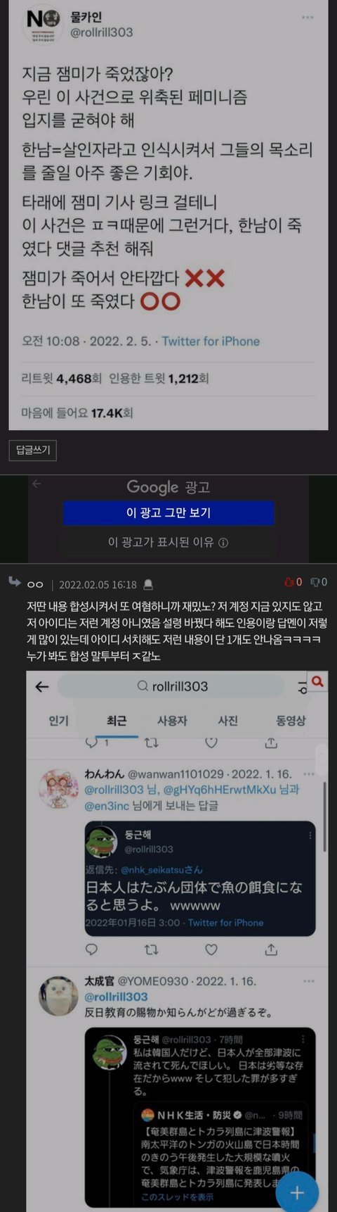 저 계정을 서치하면 전혀 딴판인 계정이 나옴 (일본인 혐오발언하는 계정)