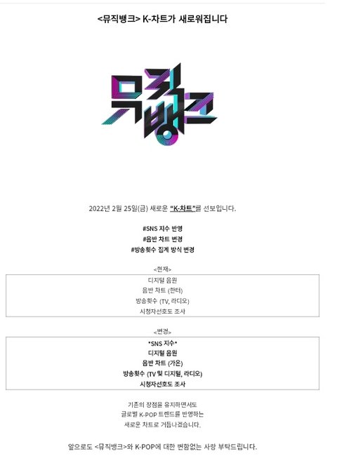 뮤직뱅크 집계방식 바뀐다네