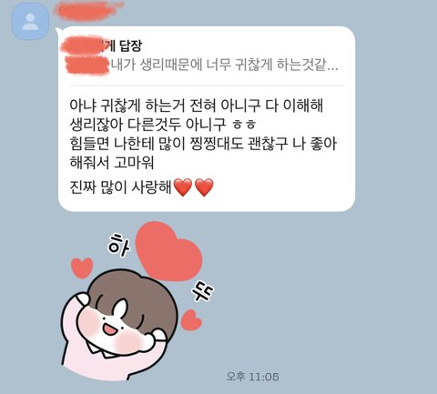 자랑이라서 일단 미안해 근데 자랑하고 싶은데 주변에 얘기할만한 친구가 없더라 항상 나 생각해주고 자기가 잘못했다고 생각하면 장문으로 길게 사과문 보내고 생리할때 맛있는거 많이 사주고 너무 착해