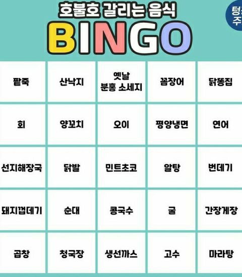 호불호 음식 빙고 주워왔는데 궁금해서 난 청국장 알탕 콩국수 빼고 다 먹는다 ㅅㅂ..ㅋㅋㅋㅋㅋㅋㅋㅋㅋㅋㅋㅋ저 세개빼고 대부분 환장함 없어서 못먹는것도 ㅈㄴ 많음 내가 돼진가 너넨 몇개 먹냐