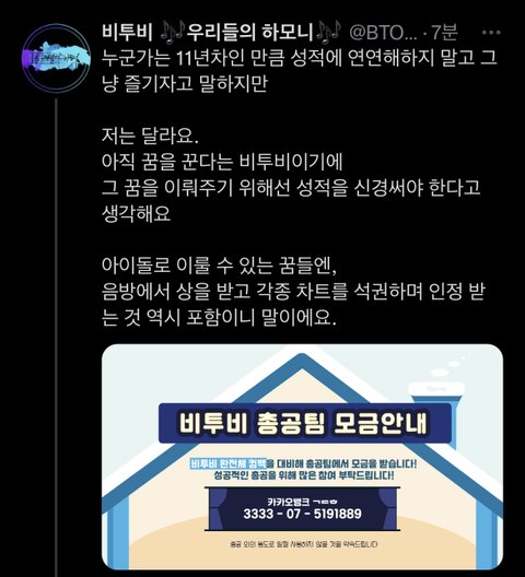 써치하면서 우리 이번 성적 어떻게 나올거다 궁예성 글 꽤 많이 봤어 그럴 때마다 오기 생기고 진짜 컴백 잘됐으면 싶고 그러더라 그리워하다는 역대급 커하를 가진 11년차 군백기 4년을 거친 아이돌 .. 그게 과거형으로만 남아있게 만들지 말자 정말 진심으로 당연히 팬덤도 차트개편도 많은 게 변했을 거야 그런데 비투비는 안 변했잖아 여전히 너무 꿈을 꾸잖아 그 꿈 우리가 받쳐줘야 이뤄진다는 거 다들 알고 있을 거야!!
