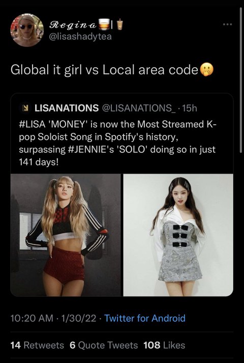 리사는 글로벌 잇걸이고 제니는 점만한 국가 한국에서만 인기 있다 이럼
