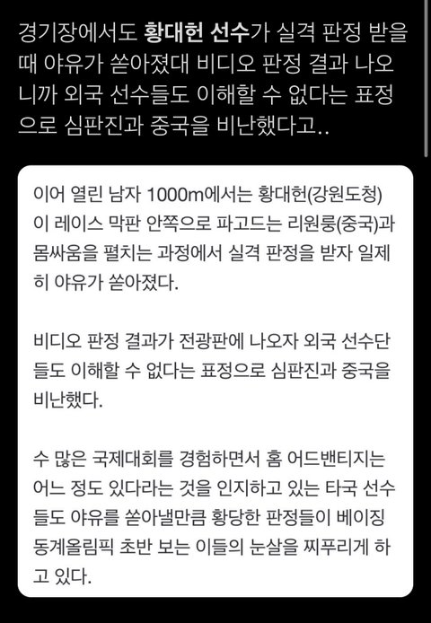 그리고 오늘 황대헌 선수가 클린하게 준결승에서 이겼거든? 근데 경로 이탈로 실격 당하고 중국 선수 2명이 결승으로 올라갔어 이건 너무 속보이는거 아닌가?