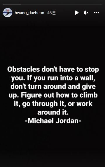 7일 황대헌은 자신의 인스타그램 스토리에 'Obstacles don`t have to stop you. If you run into a wall, don`t turn into a wall, don`t turn around and give up. Figure out how to climb it, go through it, or work aroind it (장애물을 만났다고 반드시 멈춰야 하는 것은 아니다. 벽에 부딪히면 돌아서서 포기하지 말아라. 어떻게 벽에 오를지, 뚫고 나갈 수 있을지, 돌아갈 방법이 없는지 생각해라)'라는 글을 업로드했다. 해당 글은 미국 농구 황제 마이클 조던의 명언으로 알려졌다.