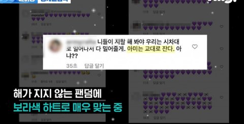 방탄멤들 인별은 댓글 못쓰게해놔서 짱깨들 방탄 공식계정가서 ㅈㄹ하는거 외랑둥이들 보라하트로 도배하는중 눈물겹다진짜 짱개들 대가리에 소주병 쌍으로 ㅊㅕ꽂았노 ㅅㅂ 쨋든 화력대단해~~~~~