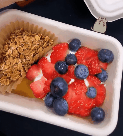 그래놀라 + 딸기 + 그릭요거트 + 꿀 (+다른 과일들)