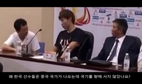 中 : 중국 국가가 나오는데 한국 선수들은 왜 중국 국기를 향해 서지 않는가?