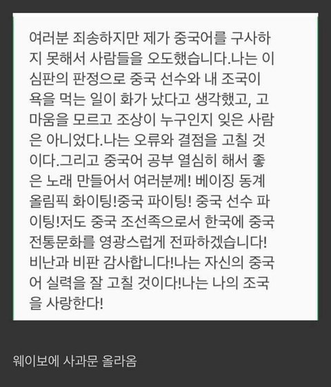 편파판정 ㅈ같다고 썼다가 인스타 테러 당하고 계정 지워지고 웨이보에 중국 찬양글 올라옴.... ㄹㅇ 무섭다ㅋㅋㅋㅋ