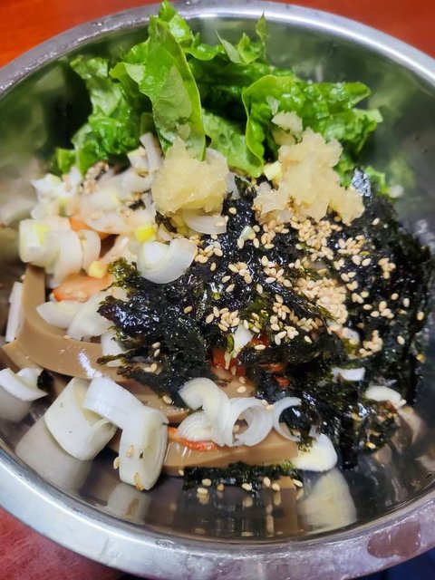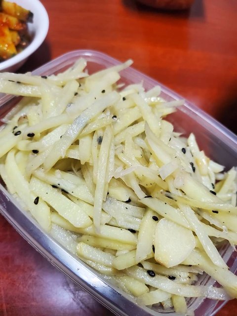 묵사발,감자채,멸치볶음,오이무침,곰피,