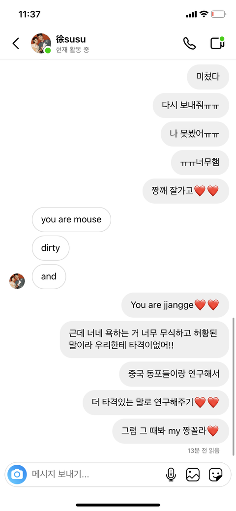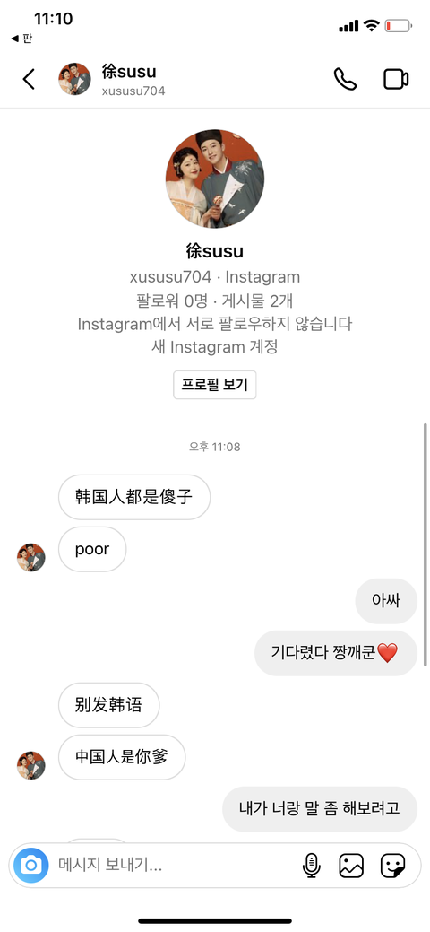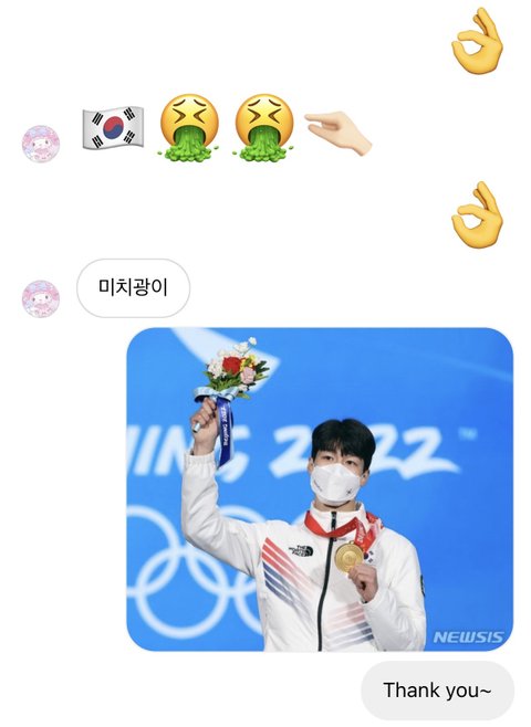 판에서 황대헌 선수 인스타에 댓들면 짱깨들한테 디엠 온다길래 해봤는데 재밌다 케케 쟤 자기 얼굴로 영상도 보냈는데 내가 녹화하려다가 놓침ㅠ근데 영어로 해달란다고 진짜 해주는 거 보면 꽤 착한 것 같기도..?