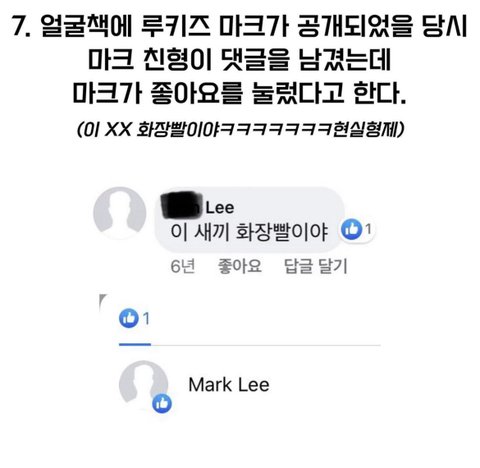 페북에 처음 루키즈 공개되고 마크 친형이 이 새끼 화장빨이야 라고 댓글 남겼는데 마크가 그 댓글에 좋아요 눌렀대 ㅅㅂ ㅠㅠㅠㅠㅠ처음들어봤는데 갸웃김 ㅠㅠㅠ 사진은 인스타에 과몰입하는 문요정님 게시물에서 캡쳐한거!! 다들 알았는진 모르겠지만 난 처음들어봐서 재미있어서.. ㅋㅋㅋㅋ큐ㅠㅠㅠ