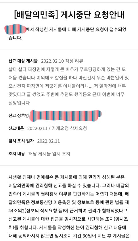 제가 삭제 요청 당할만 한가요? 배민 리뷰는 저런식인 걸 처음 알았습니다. 저는 다른 분들도 이 리뷰를 참고하실 필요가 충분히 있다고 생각하는데 삭제라니 어이가 없네요.