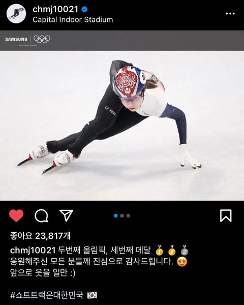 어제 1000m에서 은메달 딴 최민정 선수 인스타!
