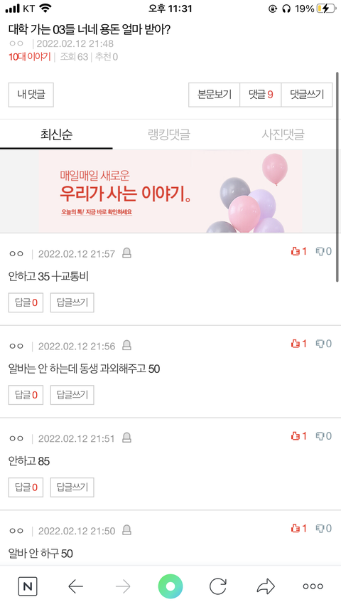 +) 용돈 받으면서 부족함 없고 불만없고 그냥 순수하게 궁금해서 물어본거라고ㅠ몇번을말해 뭐 지들끼리 내가 불만을 갖고있다 뭐다 하면서 해석하냐 그리고 이미 알바한다고