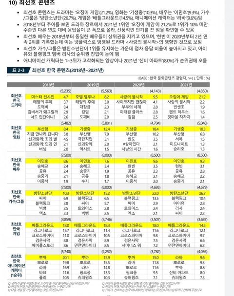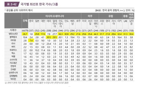 문체부에서 조사한 국가별 최선호 한국 가수 조사