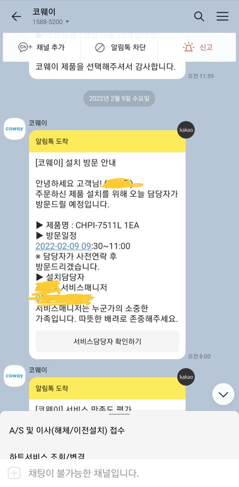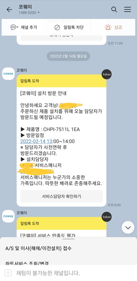 생각해보니 시간이 또 정확하지 않을 수 있어서 담당 설치기사에게 전화해보니