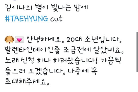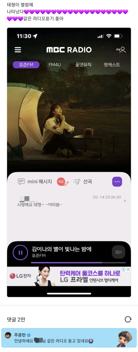 어제 위버스 댓글임 아미들이랑 같이 라디오 듣고 있는 태형이 너무 좋다ㅠ 신청곡까지 올린줄은 몰랐네 진짜 스윗해 혹시 몰라서 아미 이름은 지움