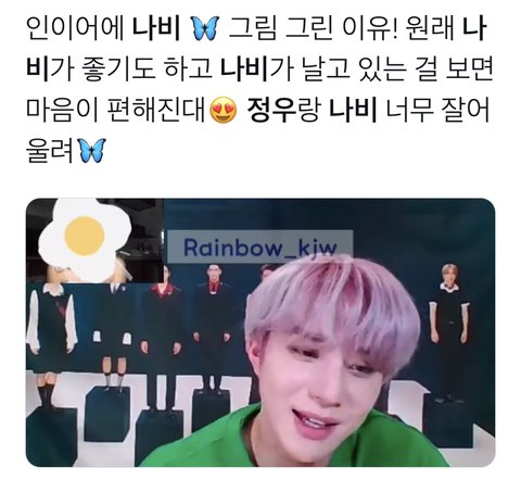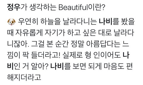 최근 뷰티풀 자컨부터 인이어 나비인 이유 읽어보면 나비가 정우한테 어떤 의미이고 얼마나 좋아하는지 알 수 있음 심지어 멤버형아 도영이도 정우가 나비 좋아하는거 알고 있음 페이보릿 나비짤 알잖아 정블리에게 의미가 큰 나비로 감동 주고 싶다ㅠㅜ 다덜 나비 투표 가보자고