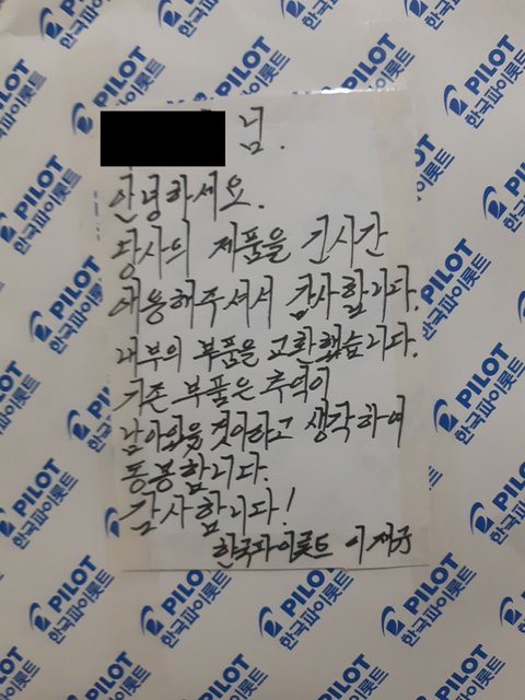 그리고 오늘 파이롯트부터 만년필이 왔다.내부의 부품을 교환하고 기존부품까지 동봉해서 정성스레 포장되있었다.안에는 메모까지 같이 있었다.