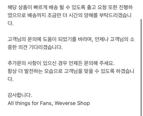 아무튼 그래서 팬라 때 못 가져갈까봐 마음 급해져서 위버스샵에 파업지역 아닌 우리 친척 집으로 배송지 변경 요청했는데 이렇게 답변 오고 내 상품 오늘 출고준비중으로 바꼈어