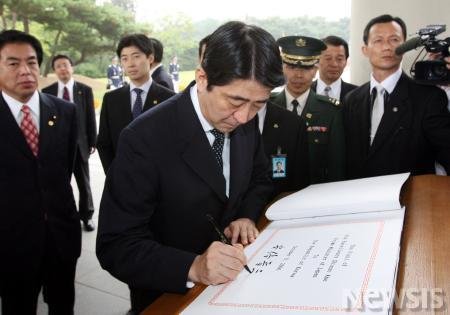 현충원을 방문해서 참배하는 아베총리