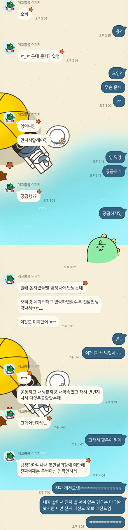 하지만, 아름이는 다음날까지 고민하더니 안 될 거 같다며 이별을 고함. 이별이라고 하기도 민망할 만큼 뭐 아무것도 한 것도 없음. 뽀뽀 세 번 한 게 전부임ㅋㅋㅋㅋㅋㅋㅋ