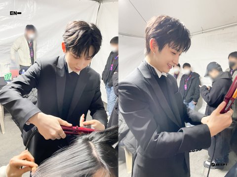 스태프들의 머리를 하고 있는 남자 아이돌이라니 성격이 좋은가 봐