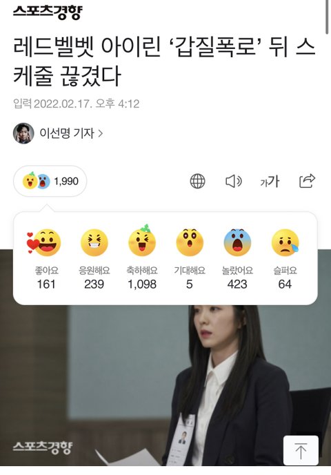 컴백기사 하루전에 연예지에 기사나고 메인 걸린것도 아닌데 사람들이 아이린 직접 검색해서 기사 찾아들어가서 마음을 찍었다....저걸 대중 반응이라고 믿어줘야 되는거야? ㅋㅋ