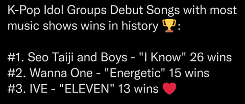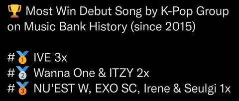 KPOP 그룹 데뷔곡 음악방송 1위 횟수 역대 3위 (기존 서태지와 아이들 워너원)