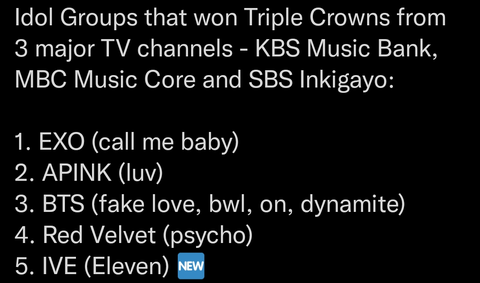 공중파 3사 트리플 크라운 5번째로 달성 기존(엑소 에이핑크 BTS 레드벨벳)