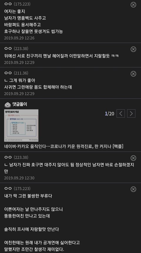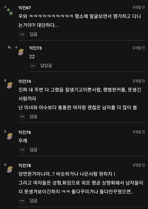 오히려 이쁜애들보다 뚱뚱하고 못생긴 것들이 더 많이 연애하던데 외모로 따지면 끼리끼리 빻은애들끼리 만나긴하지만 서로 좋으니 사귀는거겠지 좋으면 사귀는거지. 내주변에도 뚱뚱하고 못생겻는데 연애하는사람 많아
