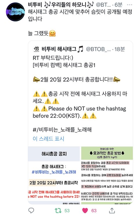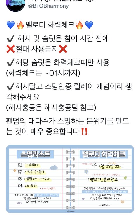 첫번째 사진 보고 오늘 11시에 화력체크용으로 스밍리스트 저렇게 만들라고했는데, 두번째 사진 보면 10시 해시태그 시간에 맞춰서 슴릿이 올라온다고 떠서요ㅠㅜ