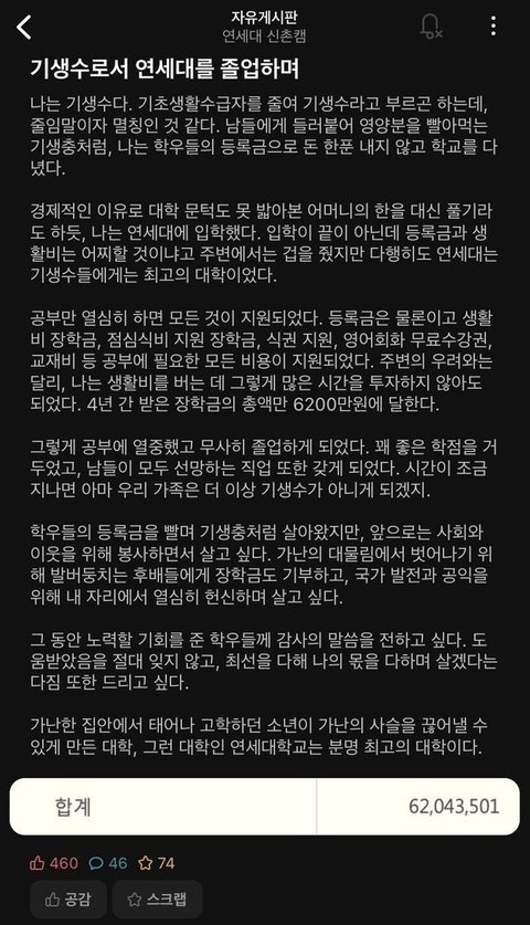 연세대에서 졸업할 때까지 6200만원의 장학금을 줬다고 함