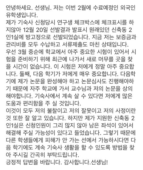 참고로 저는 외국에서 와서 누구한테 기댈곳이 없습니다. 밑에 는 제가 기숙사 담당자에게 보내려는 메세지입니다.