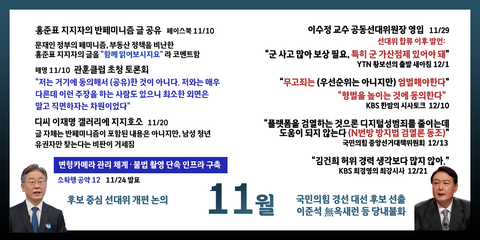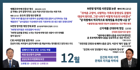12월에도 이재명 캠프의 남초 눈치보기 행보는 이어진다. 펨코에 인증샷 게시하기, CBS 씨리얼과 방송 날짜 잡았다가 지지자 항의 듣고 취소하기가 대표적이라 하겠다. 굳이 설명하고 싶진 않지만, 선거 캠프란 굉장히 다양한 생각을 가진 놈들이 드글드글 모인 곳이고 어른들의 사정이 많은지라 이 모든 행보가 이재명 본인의 의지와 큰 상관없었을 수도 있단 해석도 있다. 하지만 나는 이 글을 읽는 사람에게 굳이 그걸 다 설명하고 싶진 않다. 잘못한 것은 잘못한 것이기 때문이다. (그리고 나는 여러분이 김남국이라는 이름을 기억해두길 바란다. 그놈은 정신 좀 차려야 한다.)