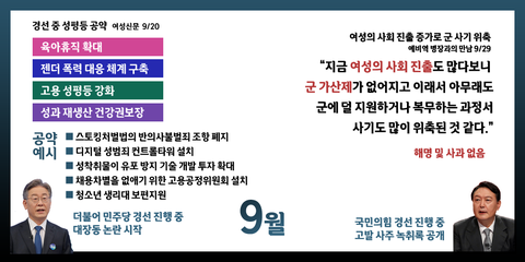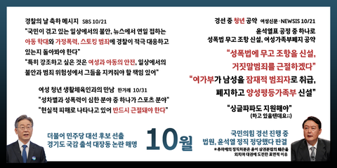 9월에는 기다리던 성평등 공약 발표가 있었다. 경선용 공약이긴 하지만 이때 발표한 4대 기조(육아휴직 확대, 젠더 폭력 대응 체계 구축, 고용 성평등 강화, 성과 재생산 건강권 보장)는 지금 내놓은 공식 공약에도 그대로 반영되어 있다. (알아보기 쉽도록 비슷한 기조의 공약은 계속 같은 색깔로 마킹할 예정이다.) 공약의 내용도 상당히 구체적이고 고용 성차별, 디지털 성범죄 등 당면한 중요 문제들을 포함하고 있어서 만족스러웠다. 10월에는 별다른 이슈는 없었지만 경찰의 날에 젠더 폭력이나 아동 학대 대응을 강화하겠다고 얘기했다든지, 첫 청년 일정으로 여성 청년 체육인을 만났다든지 하는 소소한 일들이 있었다.