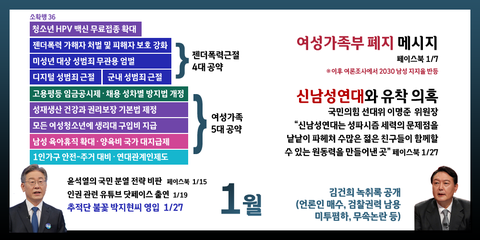 이렇게 12월 한 달 간 이재명은 이리저리 갈지자로 걸으며 표몰이에 나선다. 그러나 다행이도, 1월에 접어들면서 두 캠프의 젠더 문제 관련 입장은 확연히 차이가 나기 시작한다.