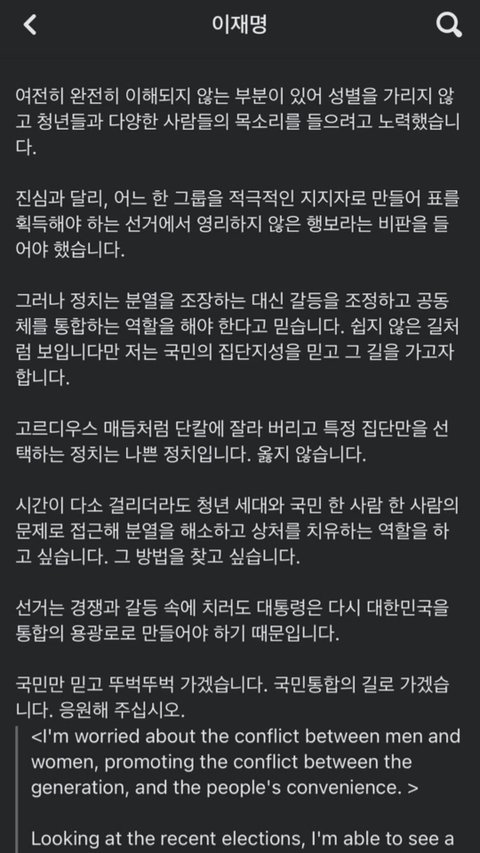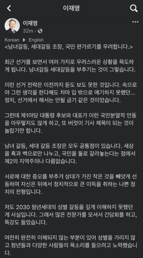 아마 이재명이 탐탁지 않은 젊은 여성들은 그가 이런 행보를 보이는 것을 주로 봐왔을 것이라 생각한다. 나는 그 못마땅함도 이해한다. 나도 실망감이 컸으니까.