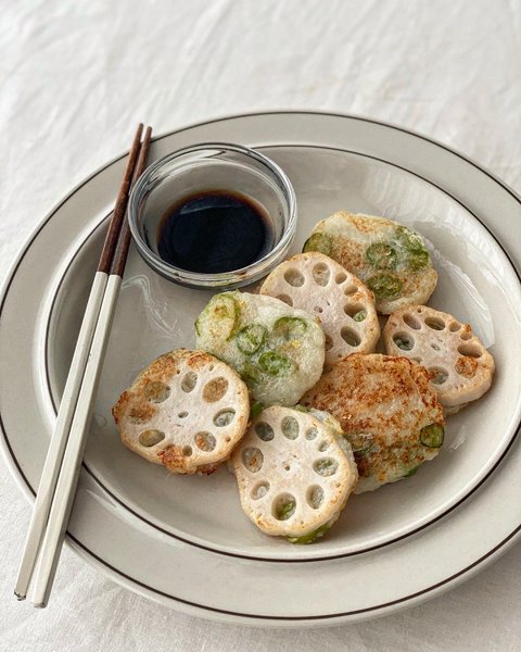 마를 갈아서 감자전분과 섞어 연근 위에 올려 앞뒤로 구워주면 쫀득한 감자떡 같은 맛이 나요 - 청양고추 송송 썰어 반죽에 섞어주면 느끼함을 줄일 수 있어요! 간장엔 식초만 살짝 해서 콕 찍어 드세요